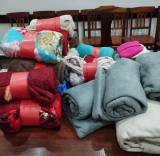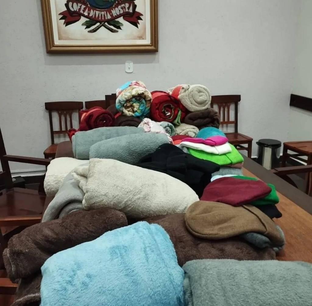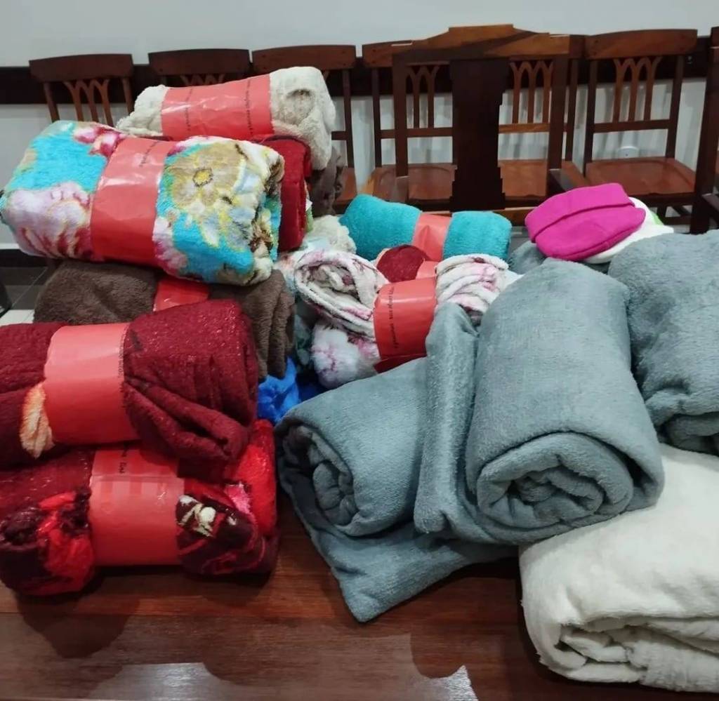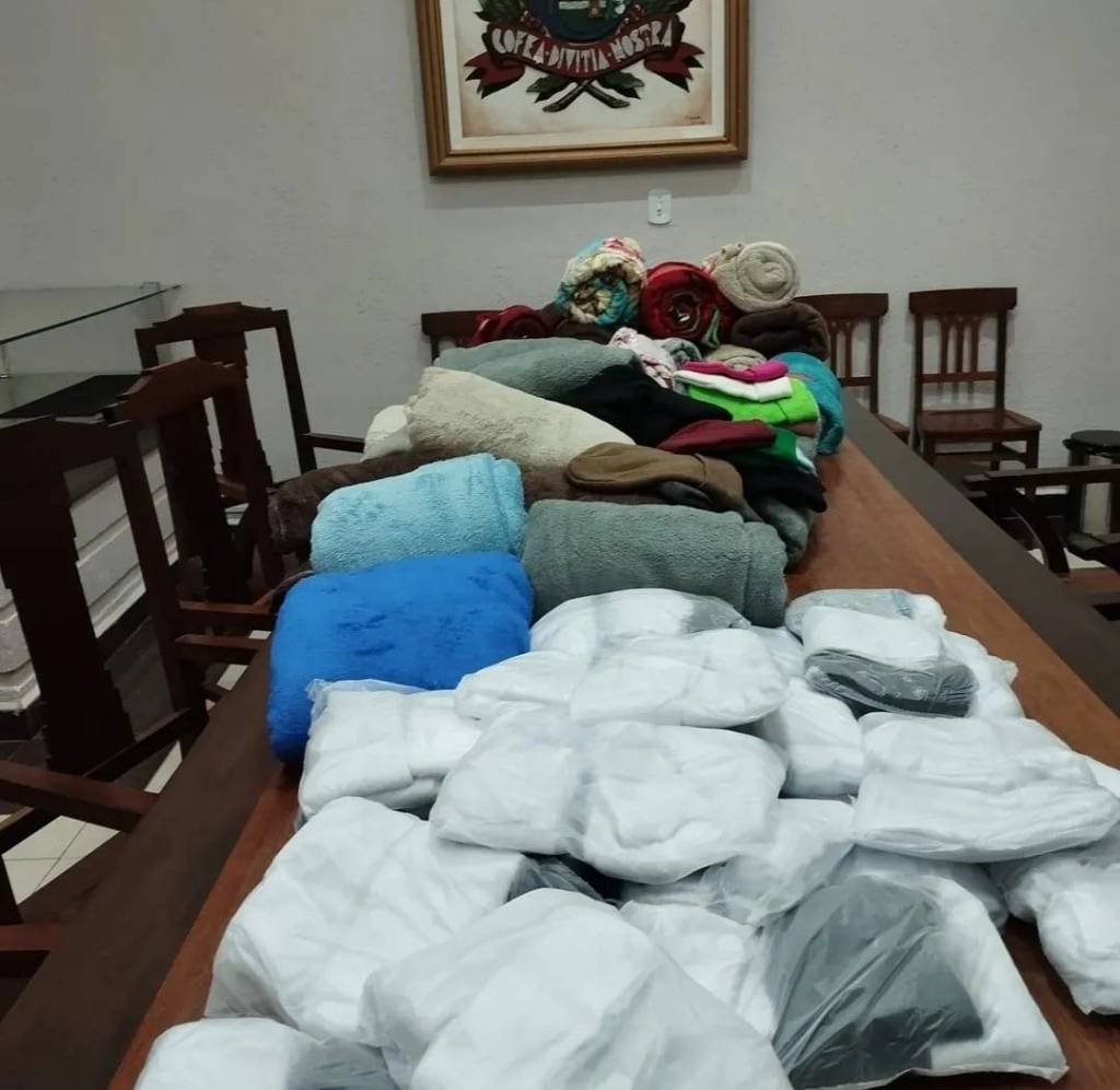Foram doadas 30 mantas, 100 pares de meias e toucas infantis para que seja feita a distribuição à comunidade.