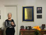 Uma mulher de meia-idade com cabelo claro, vestindo um casaco ou blazer preto sobre uma blusa de poá e uma saia escura.