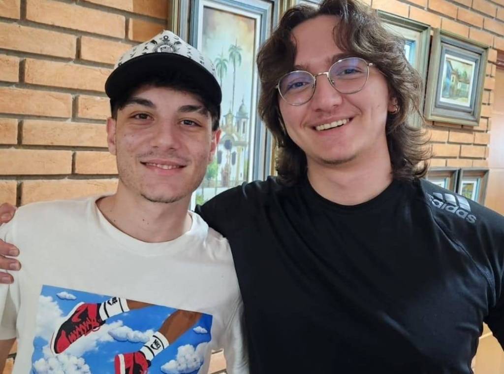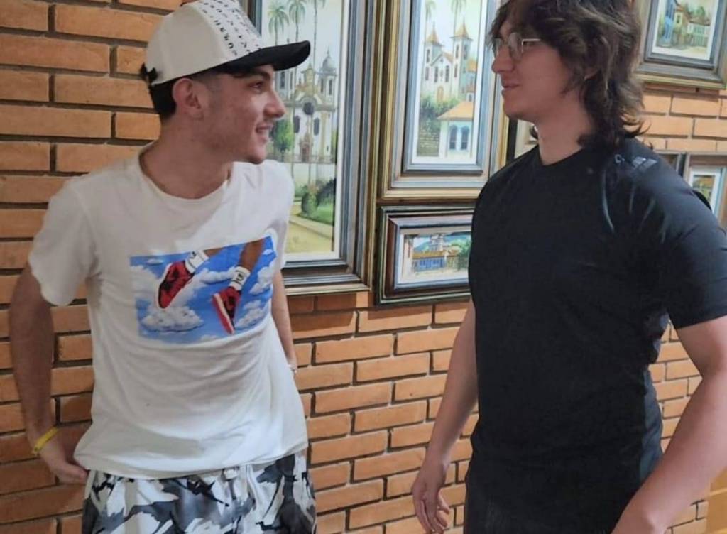 Foto de dois jovens rapazes lado a lado. O da esquerda usa camiseta branca com desenho na frente e boné, o da direta está de camiseta preta, usa óculos e tem cabelos compridos. Eles sorriem discretamente. Atrás deles uma parede de tijolos claros a vista com vários quadros dispostos nela.