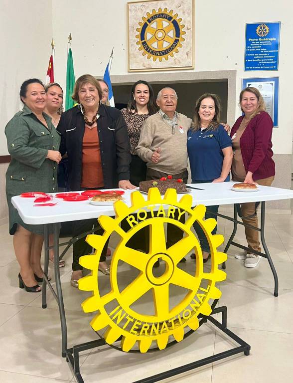 Esta é uma imagem que mostra um grupo de cerca de 25 adultos em um evento social, provavelmente um aniversário ou celebração do Rotary Club.
