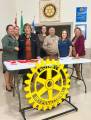 Ao fundo, há uma parede clara com alguns quadros e flâmulas, incluindo outro logotipo do Rotary International. À direita da mesa, há um quadro com texto, possivelmente um dos princípios do Rotary.