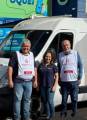 Foto em local aberto de aproximadamente 12 pessoas sorridentes, sendo seis mulheres e seis homens. Eles estão ao lado de um automóvel van de cor branca com um toldo aberto. Na lateral da van algumas inscrições, tais como: Hospital de Base, símbolo do Rotary e algo dizendo que é uma unidade móvel. Algumas pessoas usam camisetas azuis do Rotary, dois deles usam colete da campanha Hepatite Zero, um usa jaleco médico.