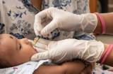 A criança está recebendo uma vacina oral que é ministrada por uma pessoa que usa duas luvas nas mãos: uma rosa por baixo e outra branca por cima.