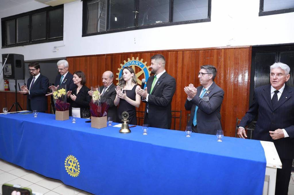 Mesa de cerimônia com nove pessoas em pé atrás de uma mesa coberta com uma toalha azul, onde está o símbolo do Rotary Club. Todos estão vestidos formalmente, com ternos e vestidos, e estão aplaudindo. No centro da mesa há um sino dourado e um martelo de madeira, típicos de reuniões do Rotary. Ao fundo, uma parede de madeira com o símbolo do Rotary International. Há copos de vidro sobre a mesa e um microfone à direita. O ambiente parece ser uma sala de eventos ou auditório.