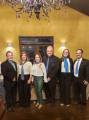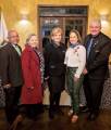 Foto de três casais lado a lado. Da esquerda para a direita um homem veste terno escuro com camisa clara e tem a seu lado uma mulher loira vestindo calça preta, camisa clara com echarpe no pescoço; no centro uma mulher também loira vestindo calça verde musgo, camisa clara bordada com lencinho no pescoço juntamente com um homem de terno escuro com gravata azul listrada; na direita o último casal: ela vestindo calça e blazer preto com blusa branca e echarpe azul e ele de terno escuro com camisa clara e gravata também azul. Todos estão sorrindo discretamente.