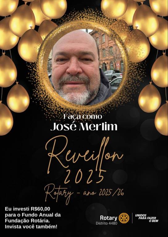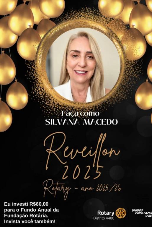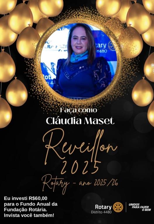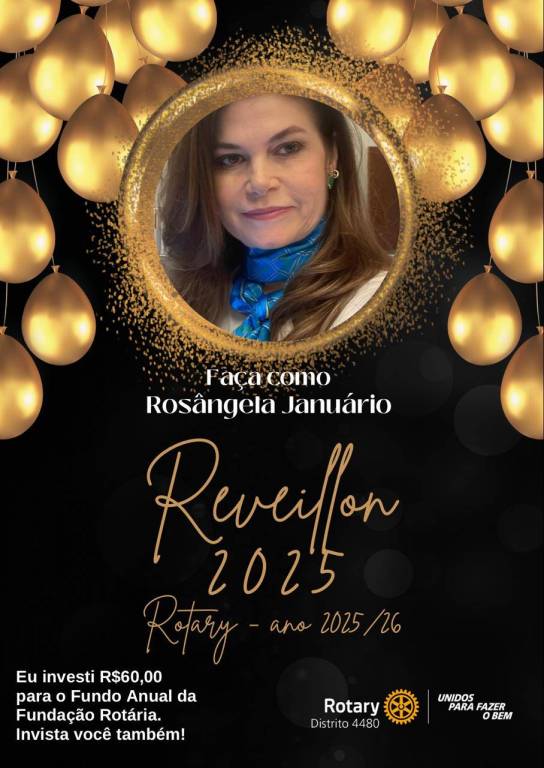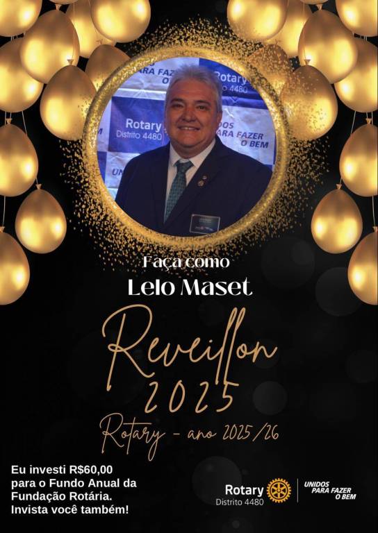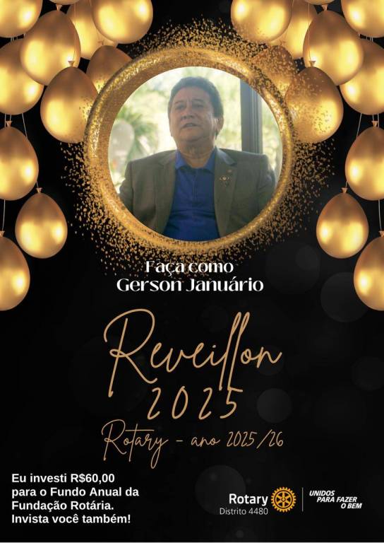 Na lateral direita também abaixo o símbolo do Rotary Distrito 4480 e o lema da gestão atual “Unidos Para Fazer O Bem”, em branco.