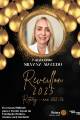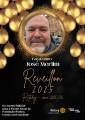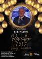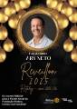 Card fundo preto com balões dourados vindo de cima para baixo até o meio, trás um círculo centralizado acima com a foto de um homem grisalho, sorridente, vestindo terno escuro com camisa clara e gravata. Circundando o círculo temos um pó dourado.