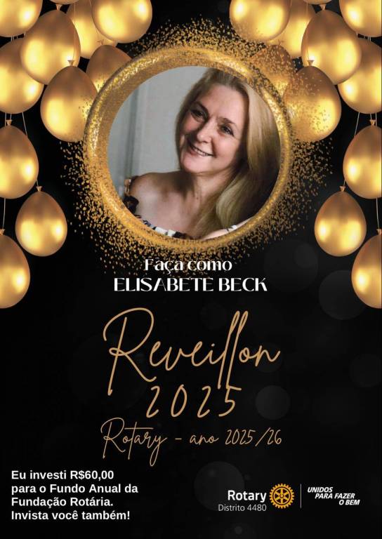 Abaixo do círculo em letras brancas: Faça como Elisabete Beck. Logo abaixo em letras douradas: