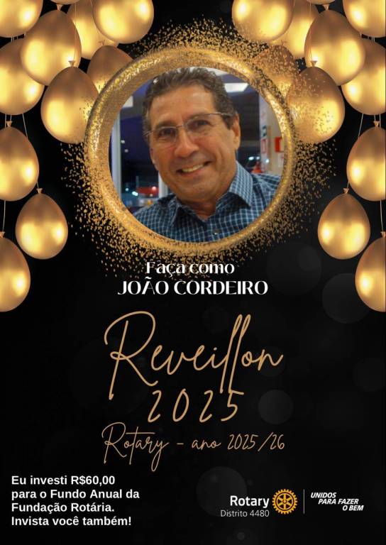 Na lateral direita também abaixo o símbolo do Rotary Distrito 4480 e o lema da gestão atual “Unidos Para Fazer O Bem”, em branco.