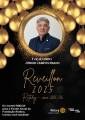 Cartaz comemorativo com balões dourados e fundo preto. No centro, há uma foto de um homem de cabelos grisalhos, pele clara, vestindo um blazer azul escuro e camisa preta, dentro de uma moldura circular dourada. Abaixo da foto está escrito: