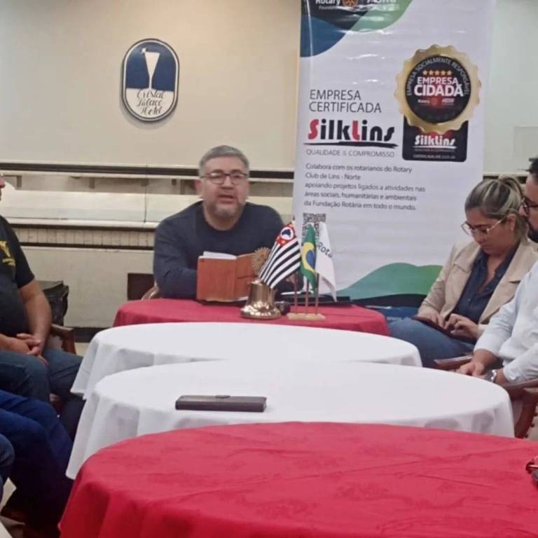 Existem outras pessoas sentadas acompanhando as mesas. Eles estão atentos a que o homem do fundo diz. Aliás, ele usa óculos, tem barba e está com roupa escura. Sobre uma das mesas brancas uma agenda de capa marrom e na mesa do fundo junto ao orador temos: um mine pavilhão de bandeiras, um sino rotário e uma agenda de pé sendo amparada pelo mesmo. Atrás deles uma parede clara com um quadro arredondado não decifrado. Na direita um grande banner de Empresa Certificada - Empresa Cidadã.