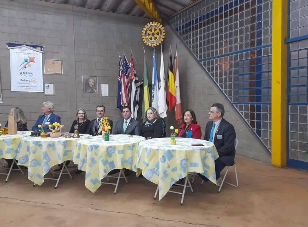 Mesa redonda com oito pessoas sentadas, todas bem vestidas, em um ambiente fechado de paredes de tijolos cinza. As mesas estão cobertas com toalhas amarelas estampadas e decoradas com pequenos vasos de flores amarelas. Atrás das pessoas, há várias bandeiras, incluindo a do Brasil, dos Estados Unidos, do estado de São Paulo e outras. Acima das bandeiras, está o símbolo do Rotary Club. Na parede à esquerda, há um quadro, uma placa e um banner do Rotary com o texto “A MAGIA DO ROTARY”. O ambiente sugere uma reunião formal ou evento do Rotary Club.