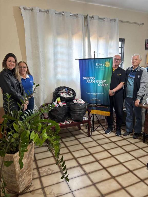 Entre eles, há um banner do Rotary Club de Jahu Leste com os dizeres: "UNIDOS PARA FAZER O BEM". Em frente ao banner, sobre um banco de madeira, estão dois grandes sacos pretos cheios de produtos, aparentemente itens de higiene ou mantimentos, com algumas caixas e embalagens visíveis. No canto esquerdo da imagem, há um vaso grande com uma planta de folhas verdes. O chão é de cerâmica bege com linhas marrons, e ao fundo há uma cortina branca cobrindo uma janela. O clima da foto é de solidariedade e ação comunitária.