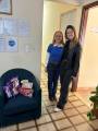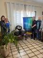Quatro pessoas em pé, sorrindo, posam para uma foto em um ambiente interno bem iluminado. À esquerda, há duas mulheres, uma delas de cabelo comprido e castanho, vestindo jaqueta preta, e a outra de óculos e camisa azul. À direita, há dois homens mais velhos, ambos de cabelos grisalhos, um deles usando óculos e camisa preta com o símbolo do Rotary.