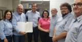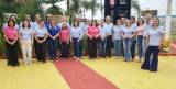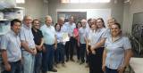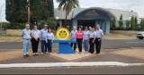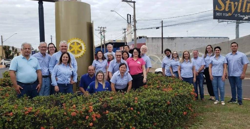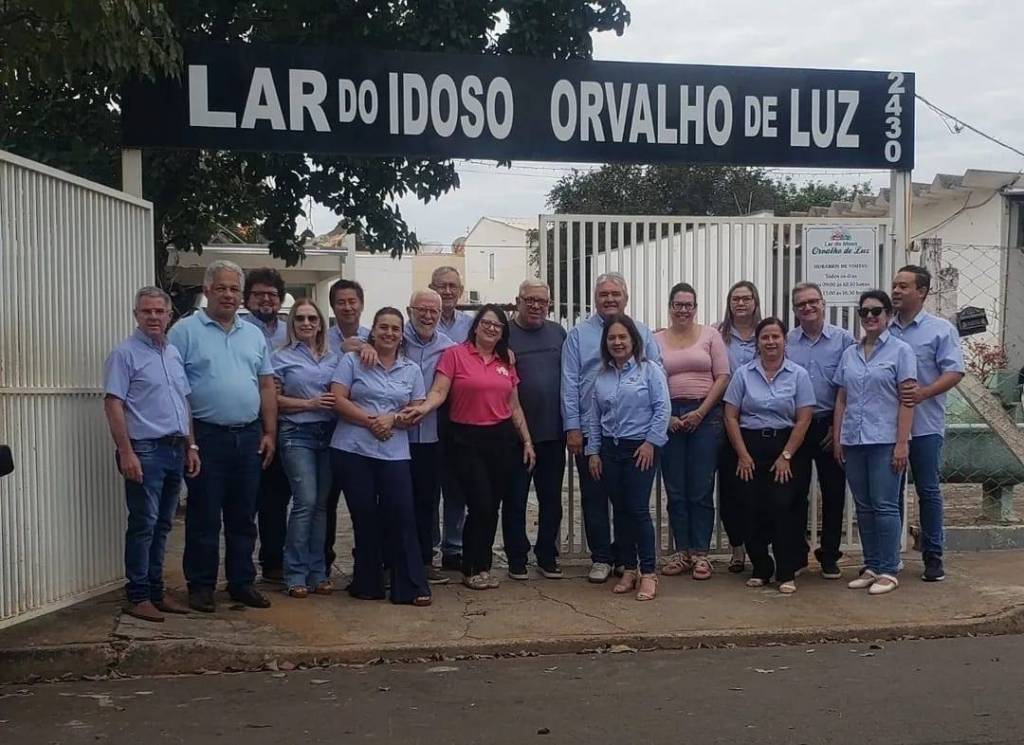 Foto diurna em local aberto, trás onze pessoas, entre homens e mulheres, posicionadas lado a lado. Somente uma mulher não veste camisa azul clara, ela está de rosa pink. Observamos a presença em meio às pessoas do casal Governador do Distrito 4480 Lelo Maset e Claudia. Eles estão à frente de uma grande construção com paredes bege com parte branca, que tem a inscrição em letras grandes marrom: