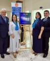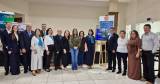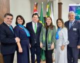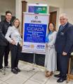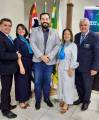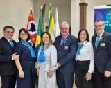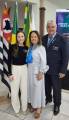 Quatro pessoas posando para foto em ambiente interno. Duas mulheres estão no centro, usando vestidos longos (uma azul escuro e outra cinza claro), ambas com lenços azuis no pescoço. Dois homens, um de cada lado, estão de terno escuro e gravata, sorrindo. Ao fundo, há quatro bandeiras (incluindo a do estado de São Paulo e do Brasil) e parte de um banner azul à direita. O ambiente parece ser de um evento formal ou corporativo.