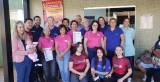Grupo de pessoas posando para uma foto em frente a uma clínica veterinária chamada "Santa Fé". Ao todo, são doze pessoas, sendo que algumas estão agachadas na frente e outras em pé atrás. O grupo é diverso, com homens e mulheres de diferentes idades. Algumas pessoas vestem camisetas coloridas com logotipos de clubes como "Rotaract" e "Interact", enquanto outras usam camisetas rosas ou azuis. Uma das mulheres está segurando uma boneca. Todos parecem felizes e estão sorrindo para a foto. O ambiente é externo, com piso de tijolos e paredes verdes ao fundo.