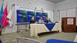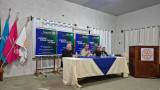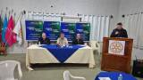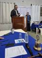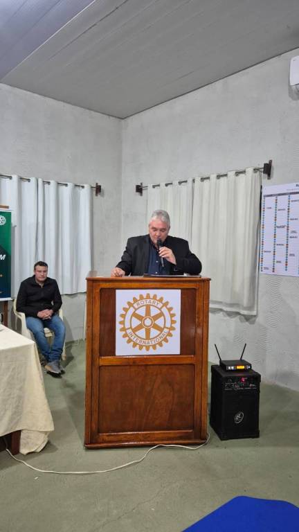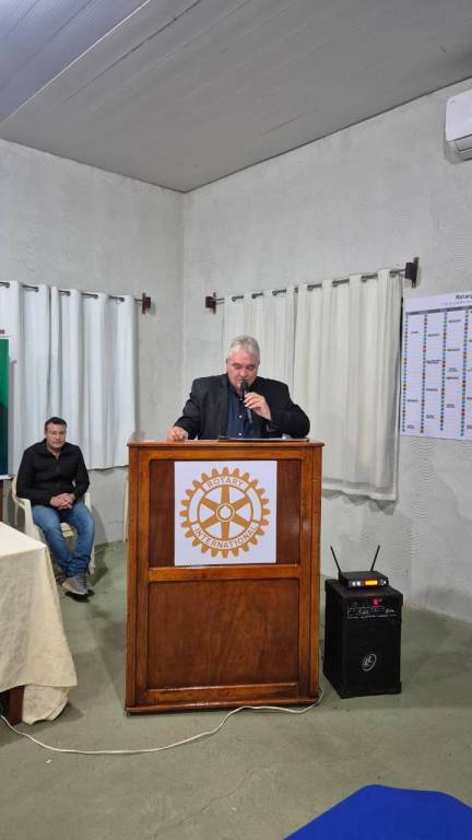 Foto de longe de uma reunião rotária. Uma mesa retangular com toalha bege e uma em azul decorando o cenário. Sentados junto à mesa três homens. No fundo uma parede clara com cortinas brancas e entre a mesa e a cortina temos posicionados lado a lado quatro banners rotários da gestão atual: “Unidos Para Fazer o Bem”. Na esquerda um pavilhão de bandeiras e na direita uma tribuna de madeira com a roda rotária na frente, traz um homem atrás da mesma falando ao microfone.